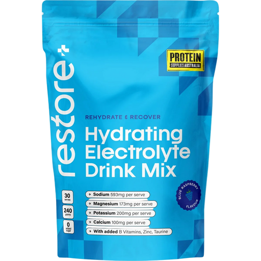 View full detailsRestore Electrolyte Drink Mix Blue Raspberry 240g Clean, sugar-free electrolyte support from Protein Supplies Australia to help you hydrate b...