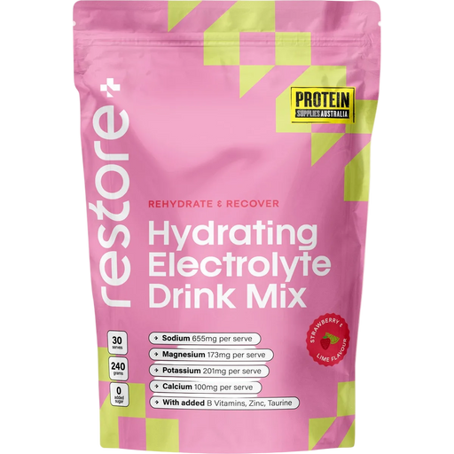 View full detailsRestore Electrolyte Drink Mix Strawberry & Lime 240g Clean, sugar-free electrolyte support from Protein Supplies Australia to help you hy...