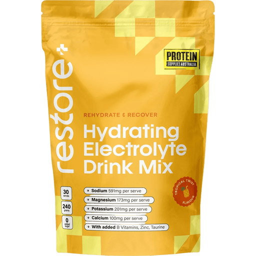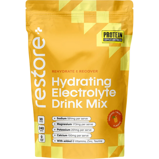 View full detailsRestore Electrolyte Drink Mix Tropical Twist 240g Clean, sugar-free electrolyte support from Protein Supplies Australia to help you hydrate b...
