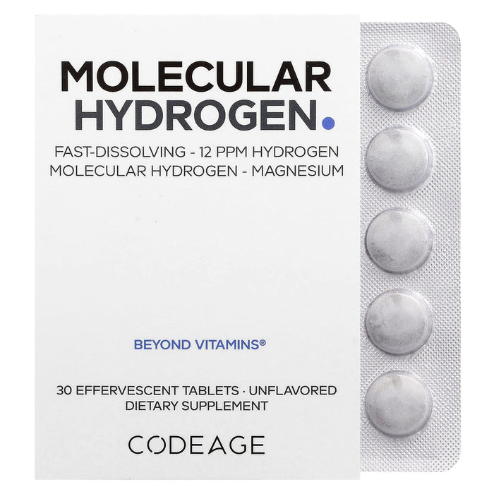 • Codeage Molecular Hydrogen offers a fast-dissolving hydrogen tablet with 12 PPM hydrogen, designed to support hydration and overall wellness in a convenient, effervescent form.